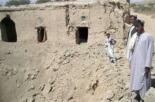 Afghanistan -- Afghan men beside a crater on the edge of their home in Pashmul, 21Sep2006 One group has called for less air strikes (file photo)